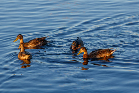 wild ducks swimming on lake at sunset