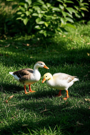 duck and goose on the green grass in the park.