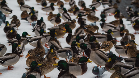 Large Group of Ducks Gathered on Snowy Ground in a Park During Winter