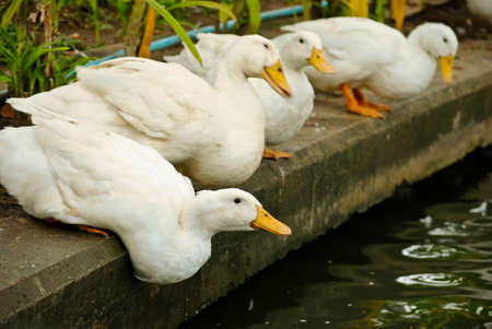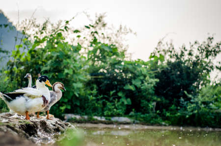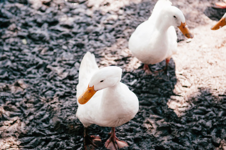 Group of white ducks on wet mud ground in rural organic free range farm, Thailand