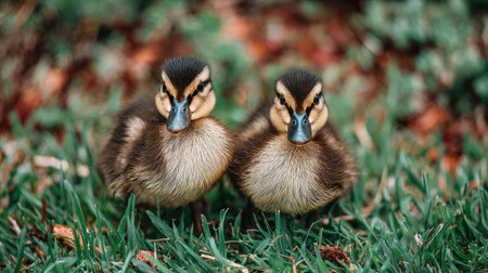 Two ducklings on green grass in the park. Close-up.