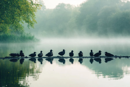 A serene row of ducks rests on a misty lake's edge, their reflections mirroring the tranquil scene, evoking a sense of peaceful harmony.