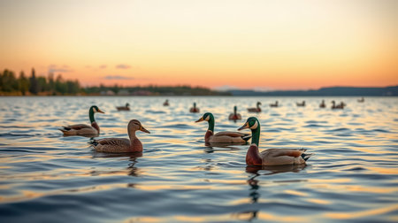 A tranquil scene captures ducks swimming gracefully on a calm lake during sunset. The serene atmosphere reflects the beauty of nature as day transitions to night.