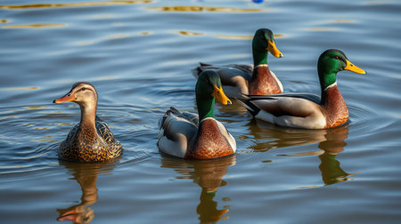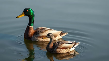 Mallard ducks swimming in a serene lake during early morning light