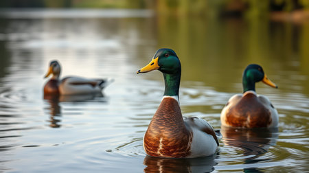 Ducks swim gracefully in a serene pond during early morning light surrounded by a peaceful natural setting