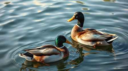 Two ducks gracefully swimming together in tranquil waters during golden hour light