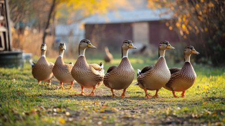 A group of six ducks strolls down a dirt pathway, surrounded by grass and fallen leaves, under the soft light of the late afternoon sun in a rural area during autumn