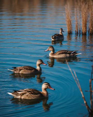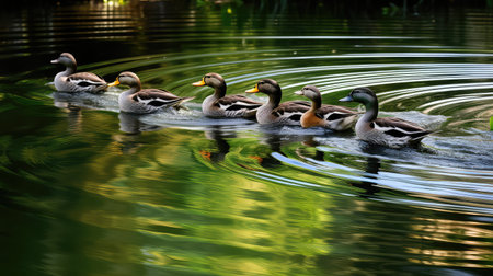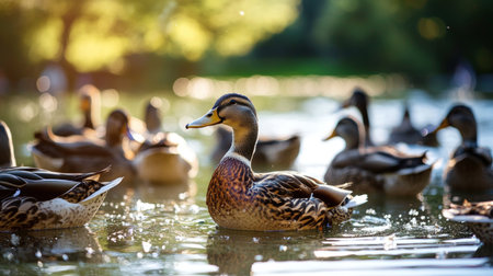 Ducks swimming calmly in a serene pond during a bright sunny day in a natural environment