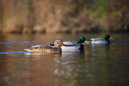 Mallard ducks swimming in the lake. Shallow depth of field.