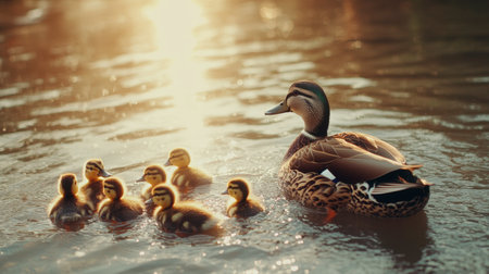 A mother duck swims peacefully with her adorable ducklings in the golden light of sunset, creating a serene and heartwarming scene in nature.