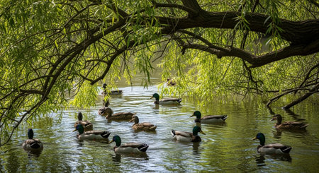 Ducks swim gracefully in a tranquil pond surrounded by nature on a sunny afternoon