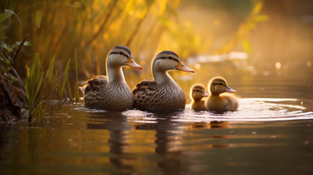 Mallard duck with ducklings swimming in a lake at sunrise