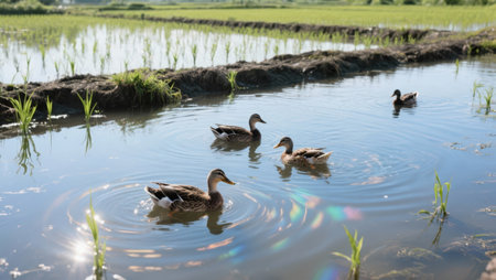 Ducks swimming in a paddy field in the countryside of Thailand