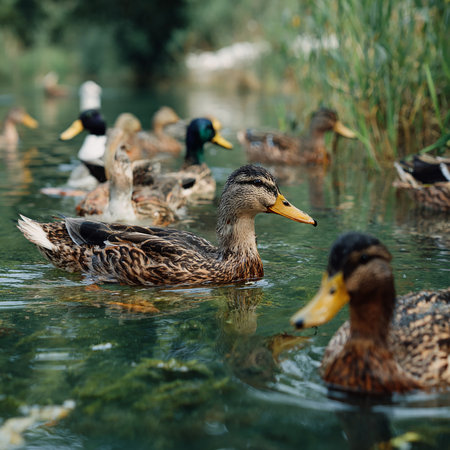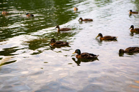 A flock of mallard ducks swims in the pond on a sunny summer day.