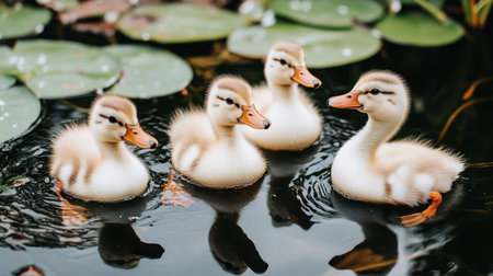 A charming image of fluffy ducklings swimming gracefully in a peaceful pond, surrounded by vibrant lily pads, capturing the beauty of nature.