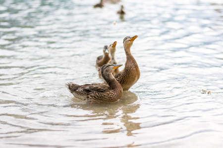Ducks on the lake. Small and young duck are waiting for food from tourists. Cute and funny animals.