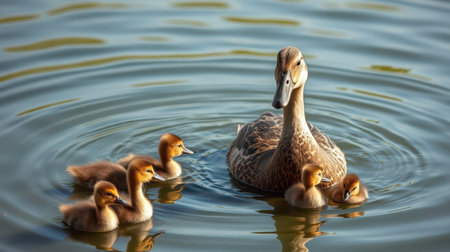 Mother duck and her ducklings in a pond. Generative AI illustration
