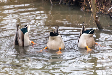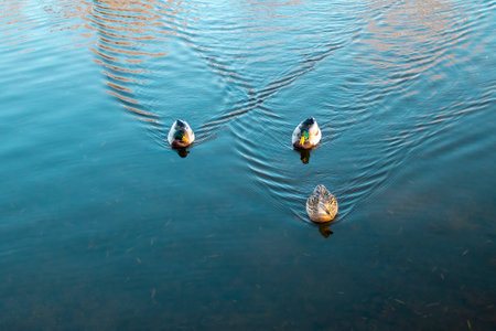 Three ducks are swimming in a body of water. One duck is sticking its head out of the water