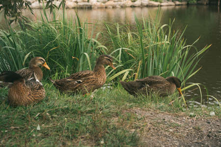 A group of wild brown ducks resting by the pond on a rainy summer day. Wildlife, waterfowl in natural conditions.