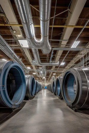 An industrial ceiling is dominated by a complex network of large, metallic pipes. These pipes, likely part of a ventilation or plumbing system, run parallel to each other, creating a strong sense of perspective and order within the industrial space. The metal surfaces show signs of wear and age, with a slightly gritty texture and subtle rust marks, contributing to a moody and authentic industrial atmosphere. Bright fluorescent lights illuminate the scene from above, casting a stark glow on...