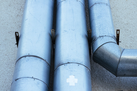 Several large and thick pipes for ventilation go up the brick wall of the house