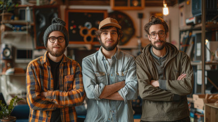 Three fashion-forward young men pose confidently in a hip, well-equipped workshop, exuding a casual yet charismatic aura.