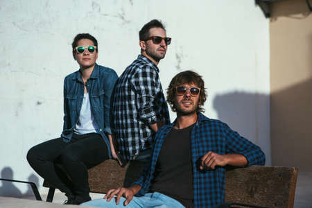 Group of three young stylish men in shirts and sunglasses sitting on bench and looking away.