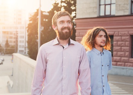 Best friends evening walk. Two men walking in centre of city at sunset, sun flare effect.