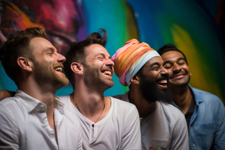 A Vibrant multicultural friends laughing together in colorful urban setting