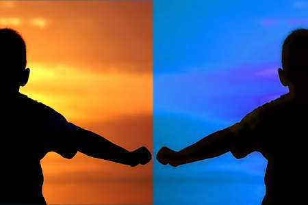 One hand points sharply towards the opposing hand that is clenched into a fist against contrasting vibrant backgrounds.