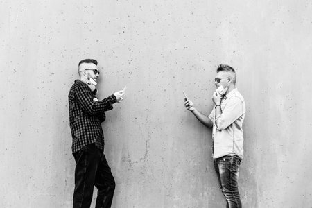 Hipster men facing each other using mobile phones while keeping social distance and wearing face medical mask - Friends watching video and texting with smartphone during coronavirus outbreak