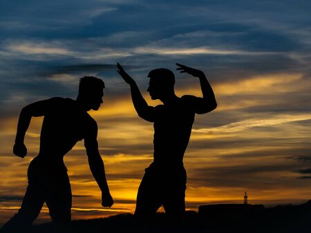 muscular men or bodybuilders silhouettes, handsome, young, male athlete people with sexy torso outdoors in sunset sky