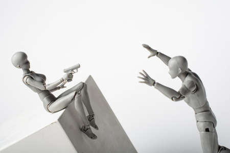 Figurine of a woman aiming a pistol at a male figurine. The man raised his hands up. The man will surrender. The woman organized a jackass robbery. Threat to life. Firearms in the hands of a lady.