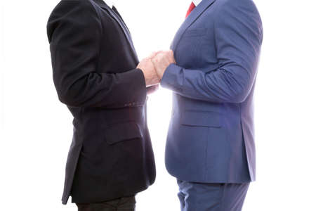 Businessmen or politicians cropped view in suits wear boxing gloves ready to fight, opposition