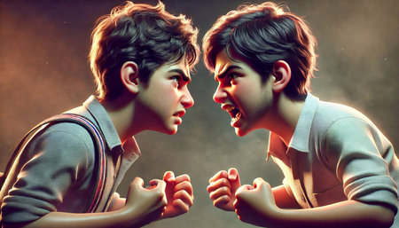 An Intense confrontation between two men with contrasting expressions, one with curly hair and other with beard, both shouting passionately against dark background