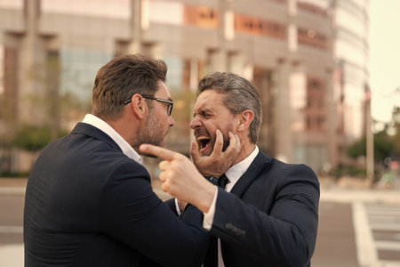 Conflict between boss and employee. Fight aggression. Angry businessmen. Business conflict. Two businessmen conflicting at fight outdoor. Businessmen having conflict in business. Fight in city