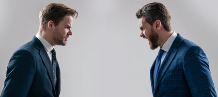 Man face portrait, banner with copy space. two angry businessmen shouting face to face have business competition, contradiction.
