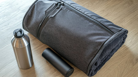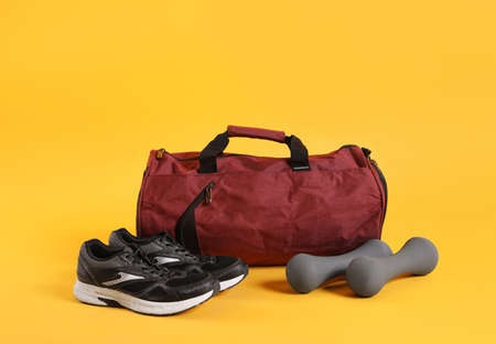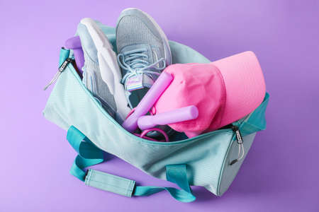 sport bag with fitness set, shoes, expander, roll for press, motivation and health lifestyle concept