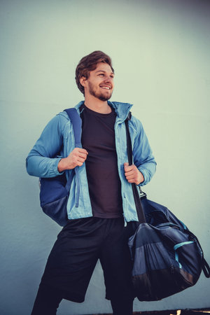 Attractive bearded positive sporty male in a blue jacket with sports bag on his shoulder.