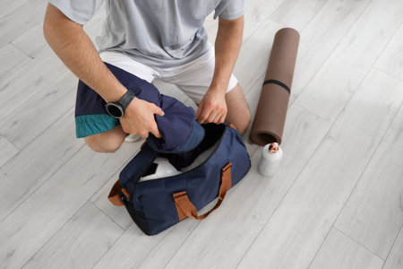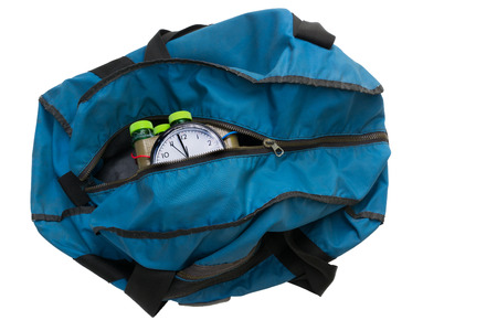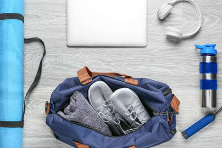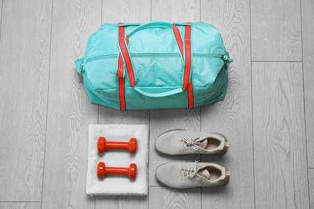 Sports bag with gym stuff and equipment on white floor, flat lay