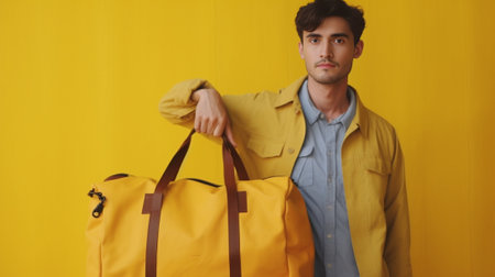 Full length of playful young man carrying leather bag and making a face while hovering against yellow background : Generative AI