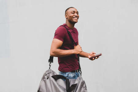 Full length portrait happy African american male traveler walking on street with cellphone and suitcase