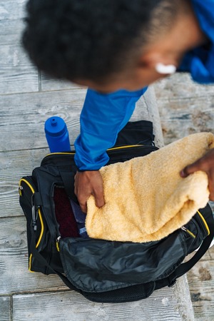 Cropped picture of a handsome young african sports man outdoors at the beach sea walking with bag.
