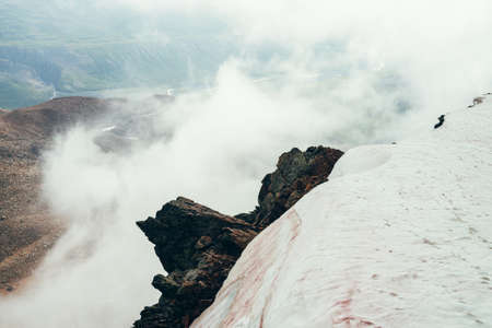 Beautiful pointy cliff on high rocky mountain edge with snow among thick low clouds. Atmospheric minimalist alpine landscape. Pointed craggy stone near abyss in clouds. Wonderful highland scenery.