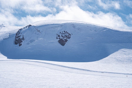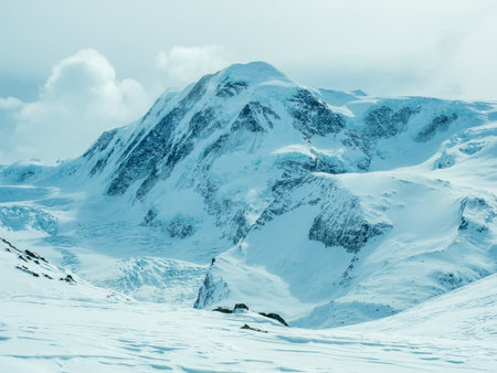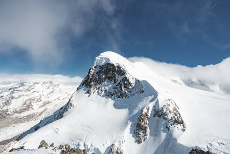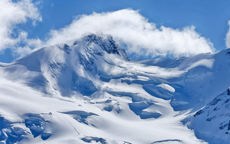 Snowy summit Breithorn and Klein Matterhorn view point on cloudy day, Pennine Alps above Zermatt. Glaciated massif with snow cornices and crevasses. Heavy fog and a lot of clouds
