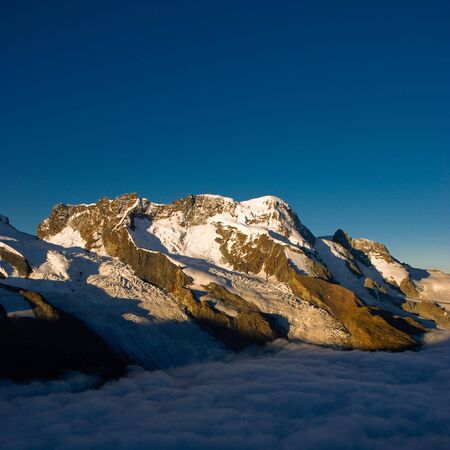 Breithorn above the clouds in early morning with deep blue sky. Zermatt. Switzerland.