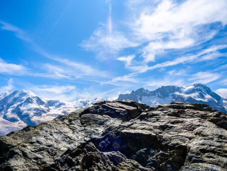 Beautiful black stone on top of mountain range on Swiss Alps with nobody, mountains view with snow on the peaks, mountains landscape on blue sky background, summer season in Zermatt, Switzerland.