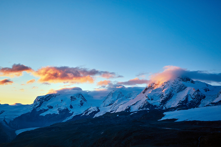 beautifull cloudy sunrise in the mountains with snow ridge. Alps. Switzerland, Trek near Matterhorn mount.