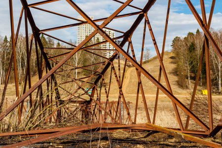 Rusted lattice structure of a dismantled power line tower frames a distant modern high-rise building against a partly cloudy spring sky