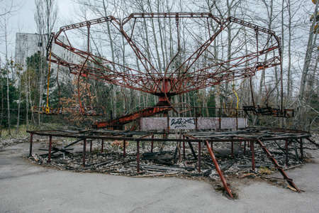 Abandoned carousel and abandoned ferris at an amusement park in the center of the city of Pripyat, the Chernobyl disaster, the exclusion zone, a ghost town